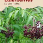 Elderberries are ripe and ready to harvest when they are dark purple or black in color. Elderberries will easily come off the stem when ready to harvest. You can test this by gently squeezing an elderberry – if it pops off the stem, it is ready to be harvested.