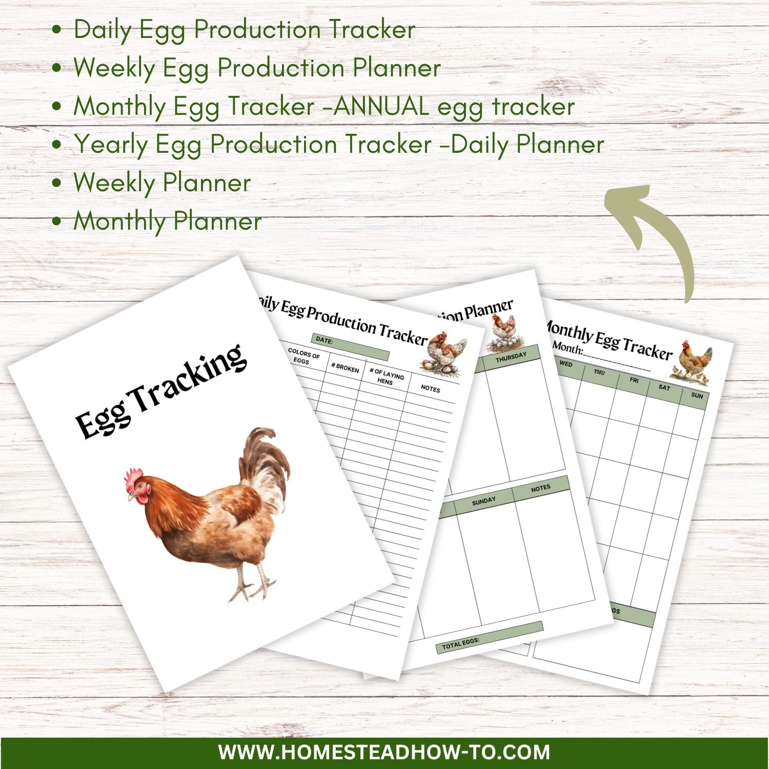 Stay on top of your flock’s performance with daily, weekly, monthly, and annual egg tracking sheets. - Daily to Monthly Planners