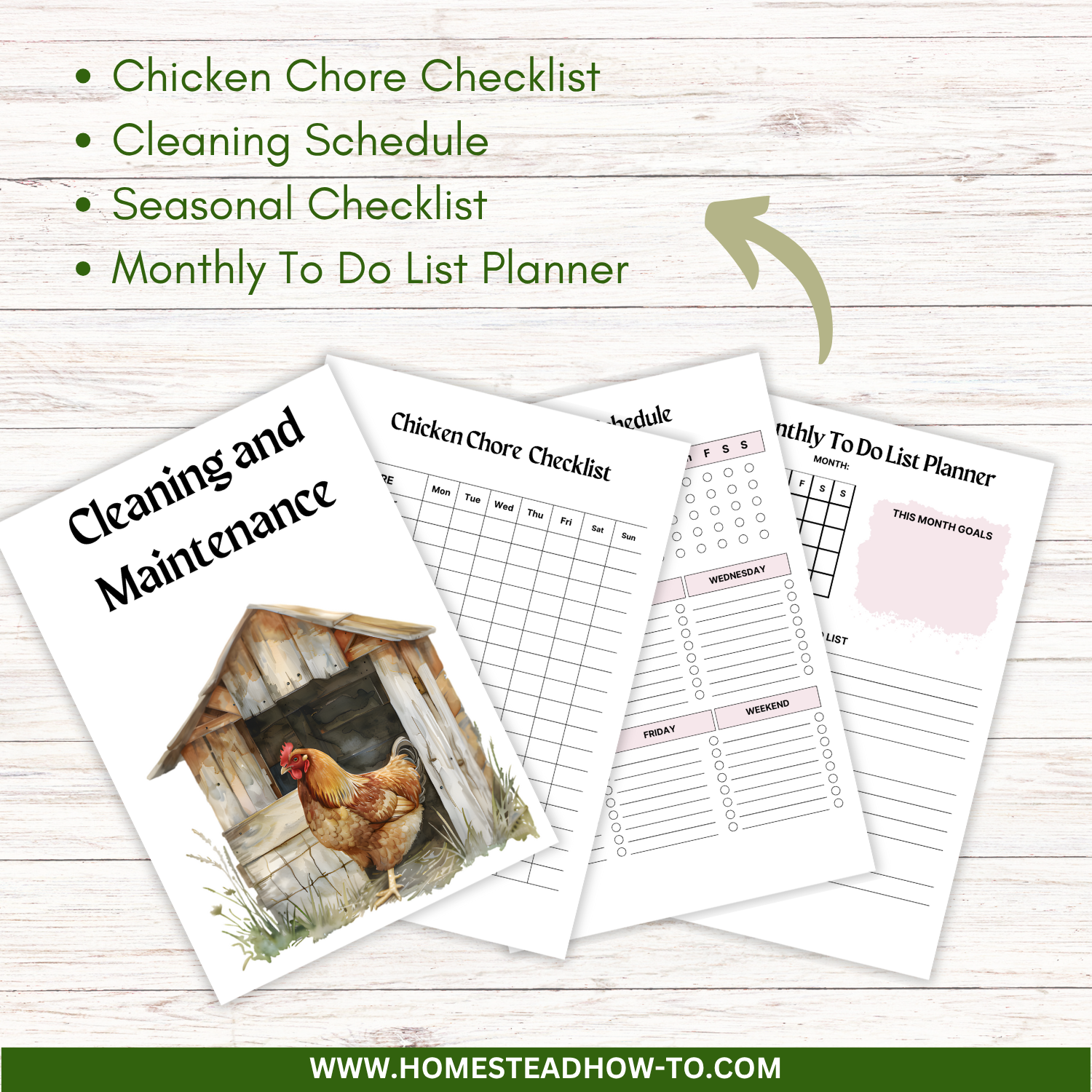 Maintain a clean and healthy coop with chore checklists, cleaning schedules, seasonal upkeep plans, and monthly task sheets. - Flock Information