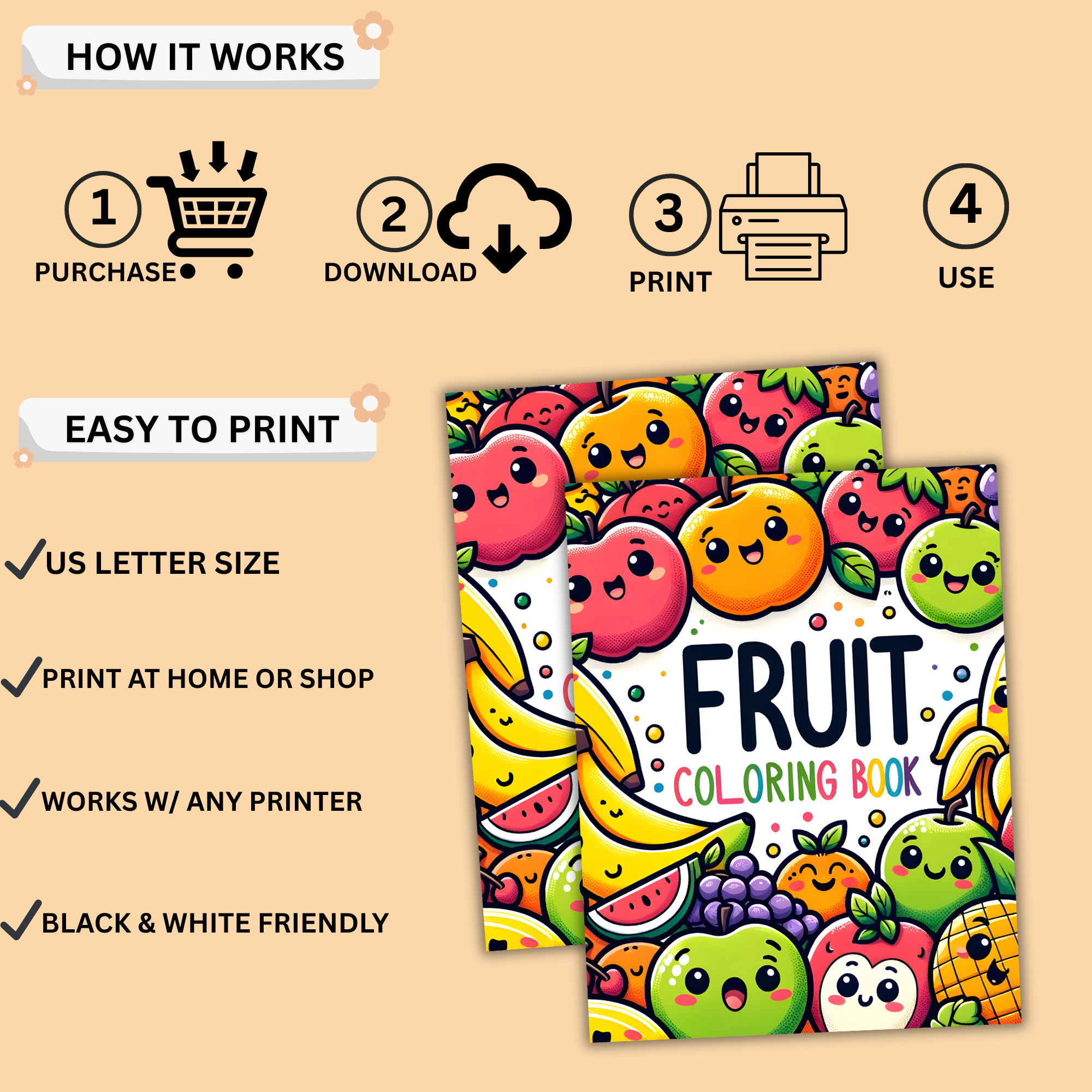 • Multiple fruit-themed coloring pages