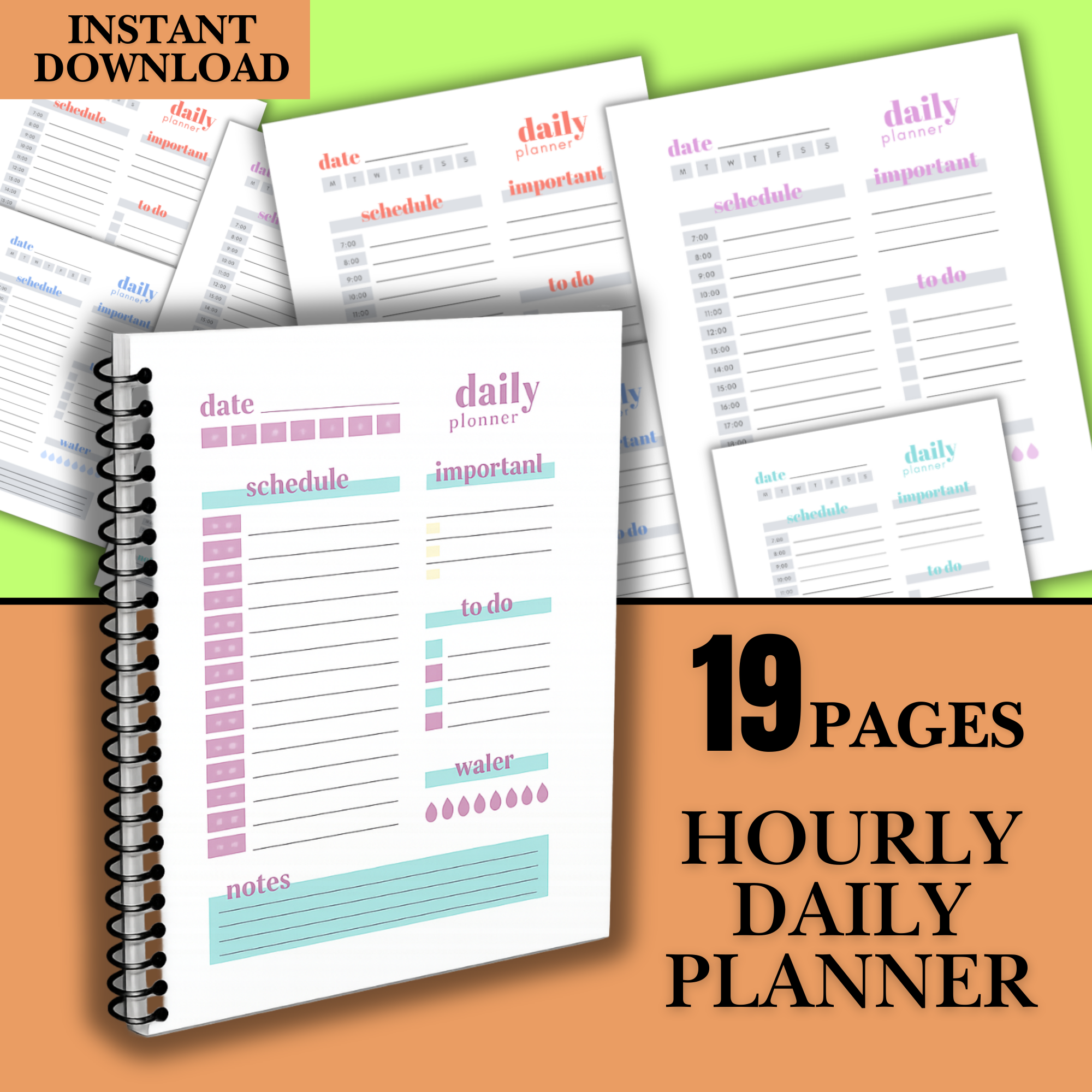 This daily planner set includes multiple pages with different color themes: