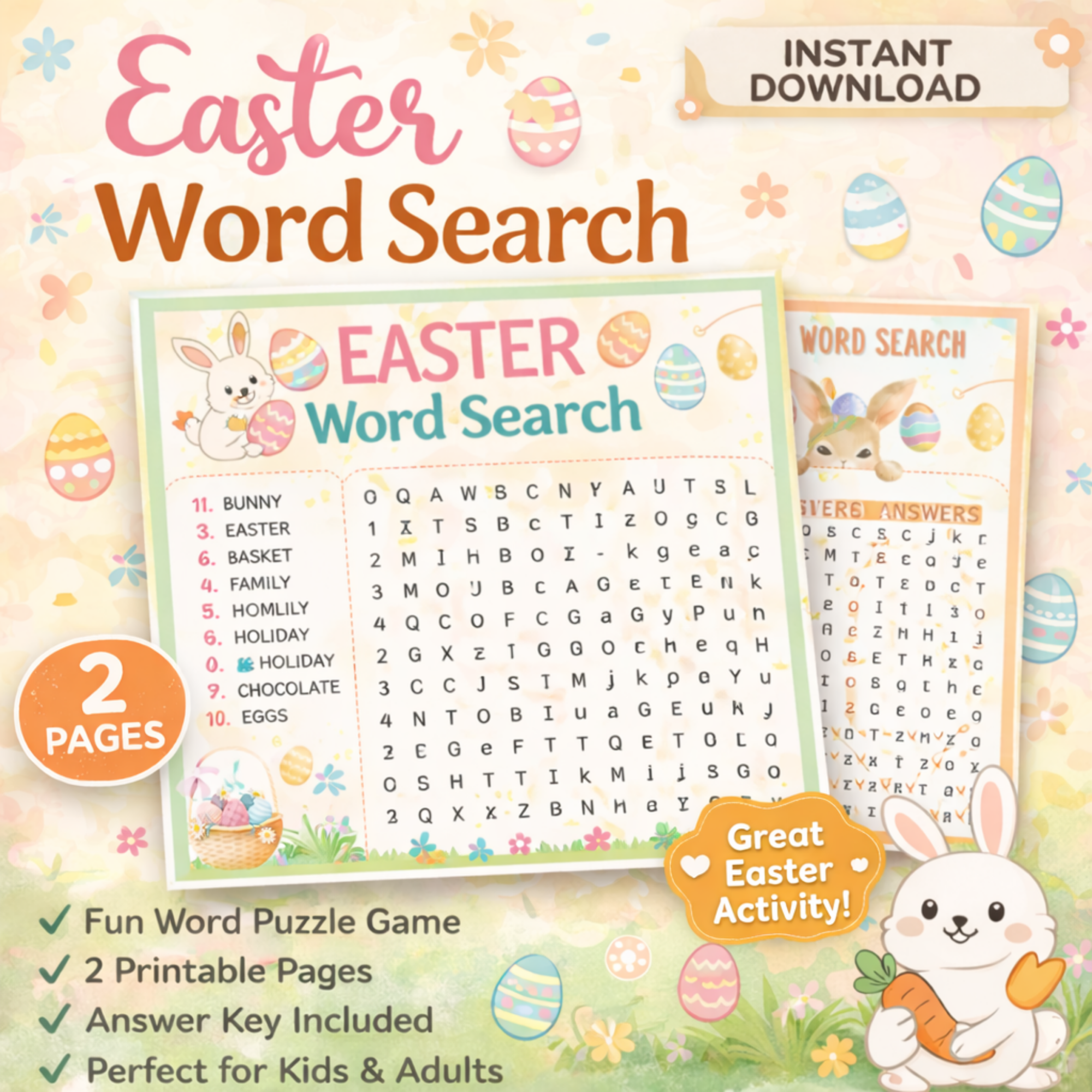Fun and engaging Easter Word Search Printable PDF for kids! Includes a themed puzzle and answer sheet—perfect for classrooms, homeschool, or Easter activities. Instant download, easy to print, and great for learning and fun.
