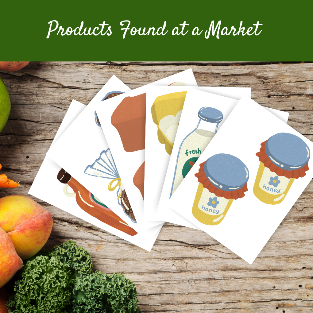 - Product Labels: Helps children learn to identify various fruits, vegetables, and other products commonly found at a market.