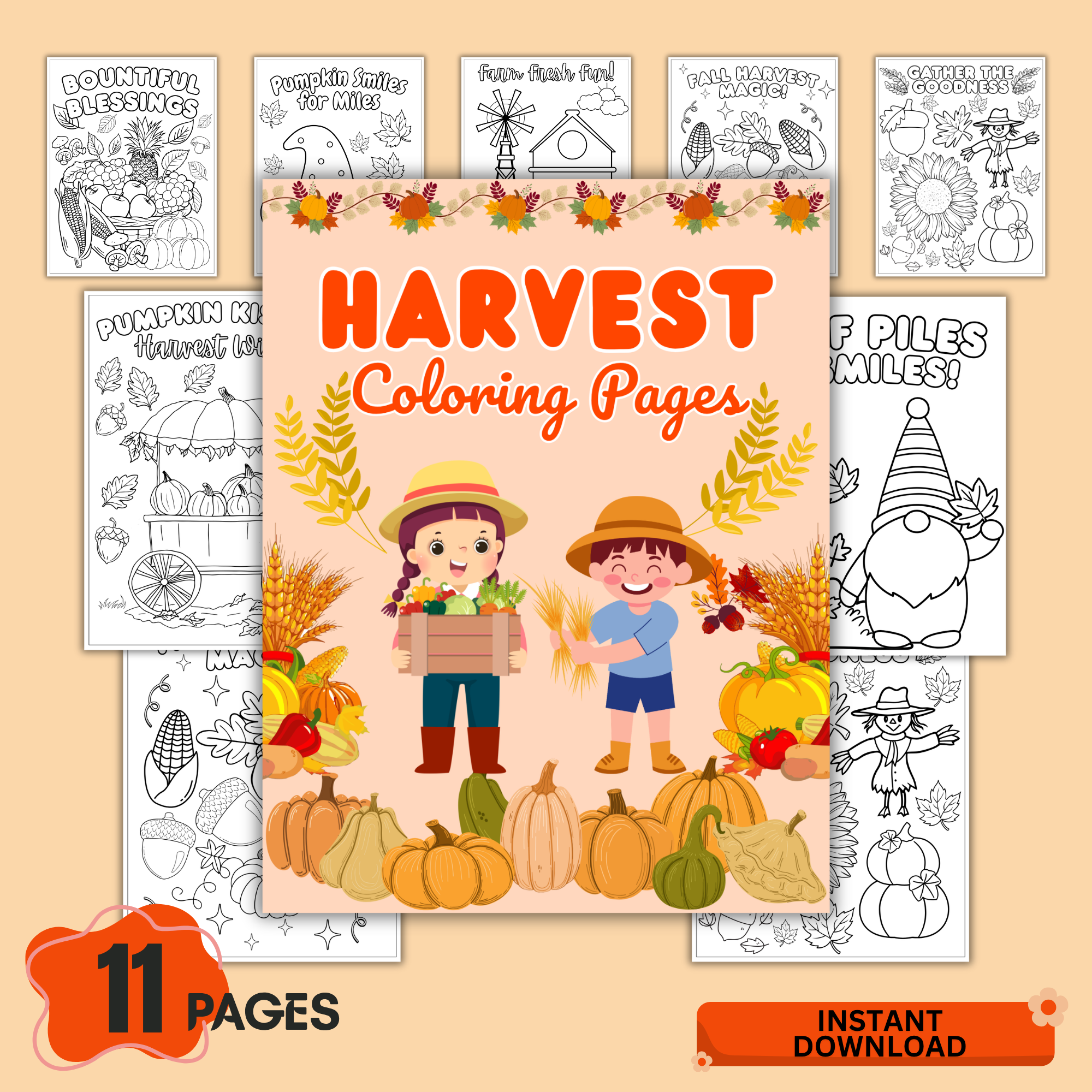 Fun and cute Harvest Coloring Pages printable PDF for kids. Includes 15 fall-themed coloring sheets with pumpkins, leaves, and autumn scenes—perfect for homeschool, classroom, and seasonal activities.