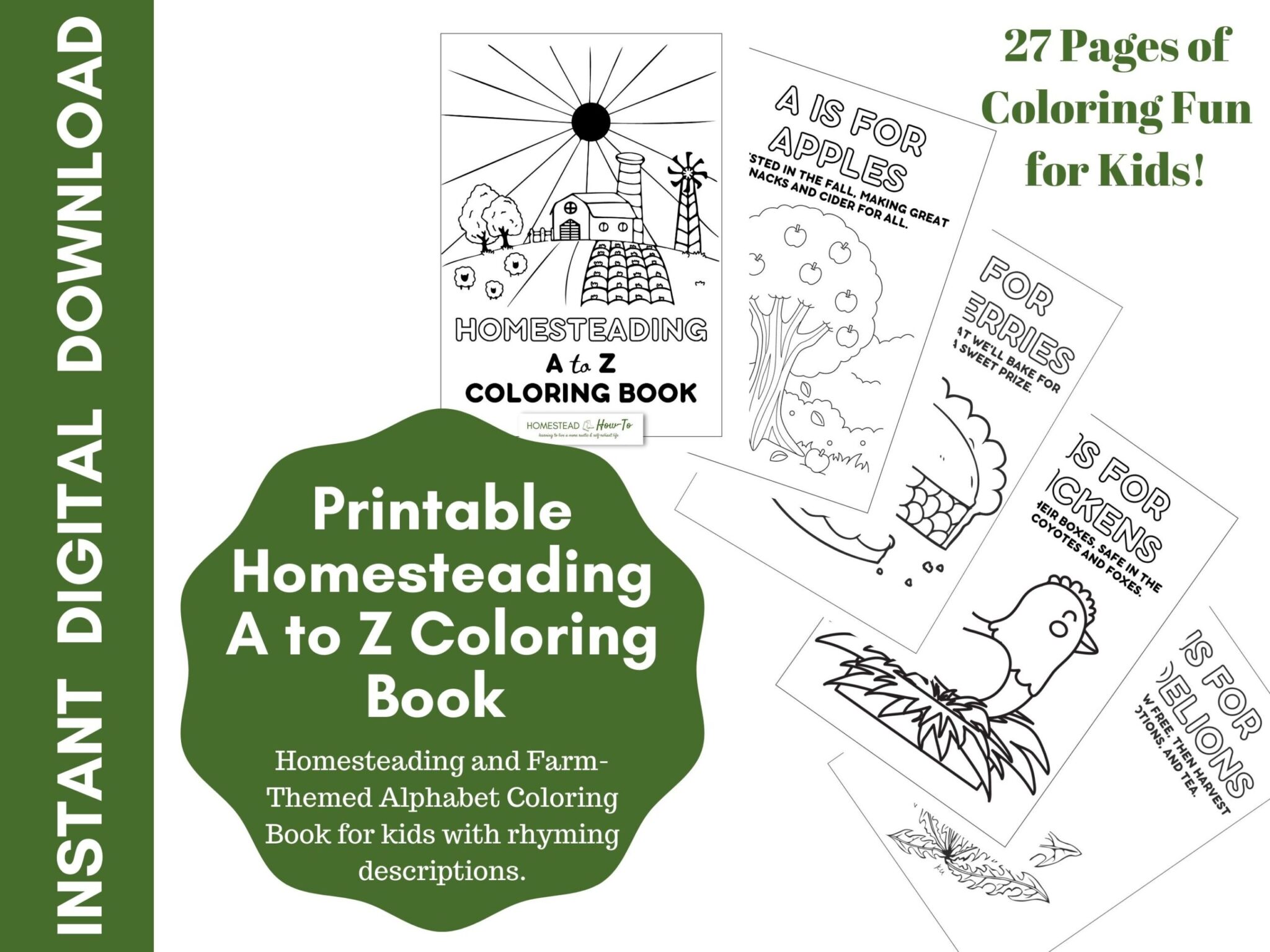This cute coloring book helps kids learn about homesteading and farming topics like animals, plants, and self-reliance strategies. Each page includes a fun image to color and a rhyming description of that topic – from Apples to Zucchini and everything in between!