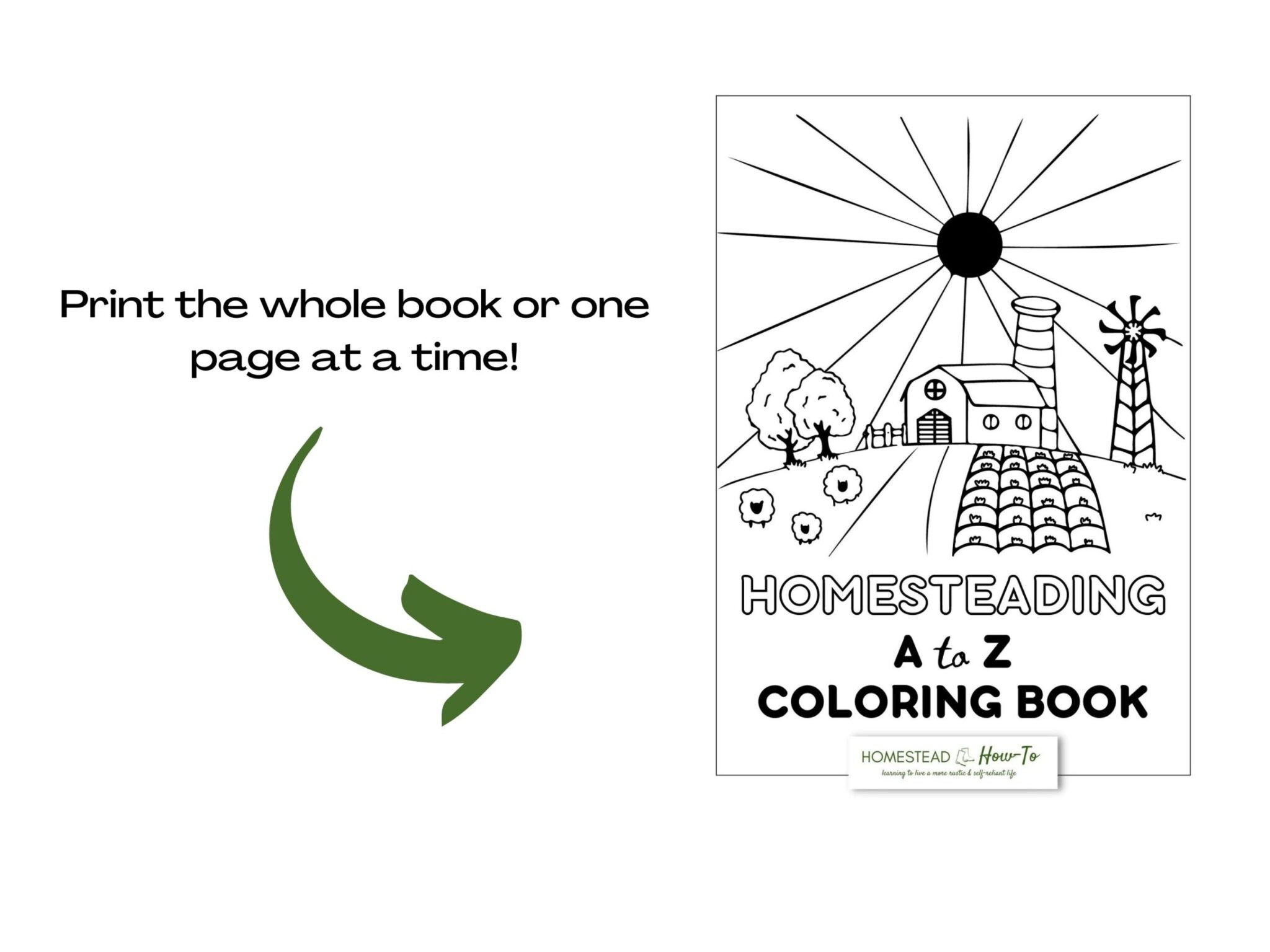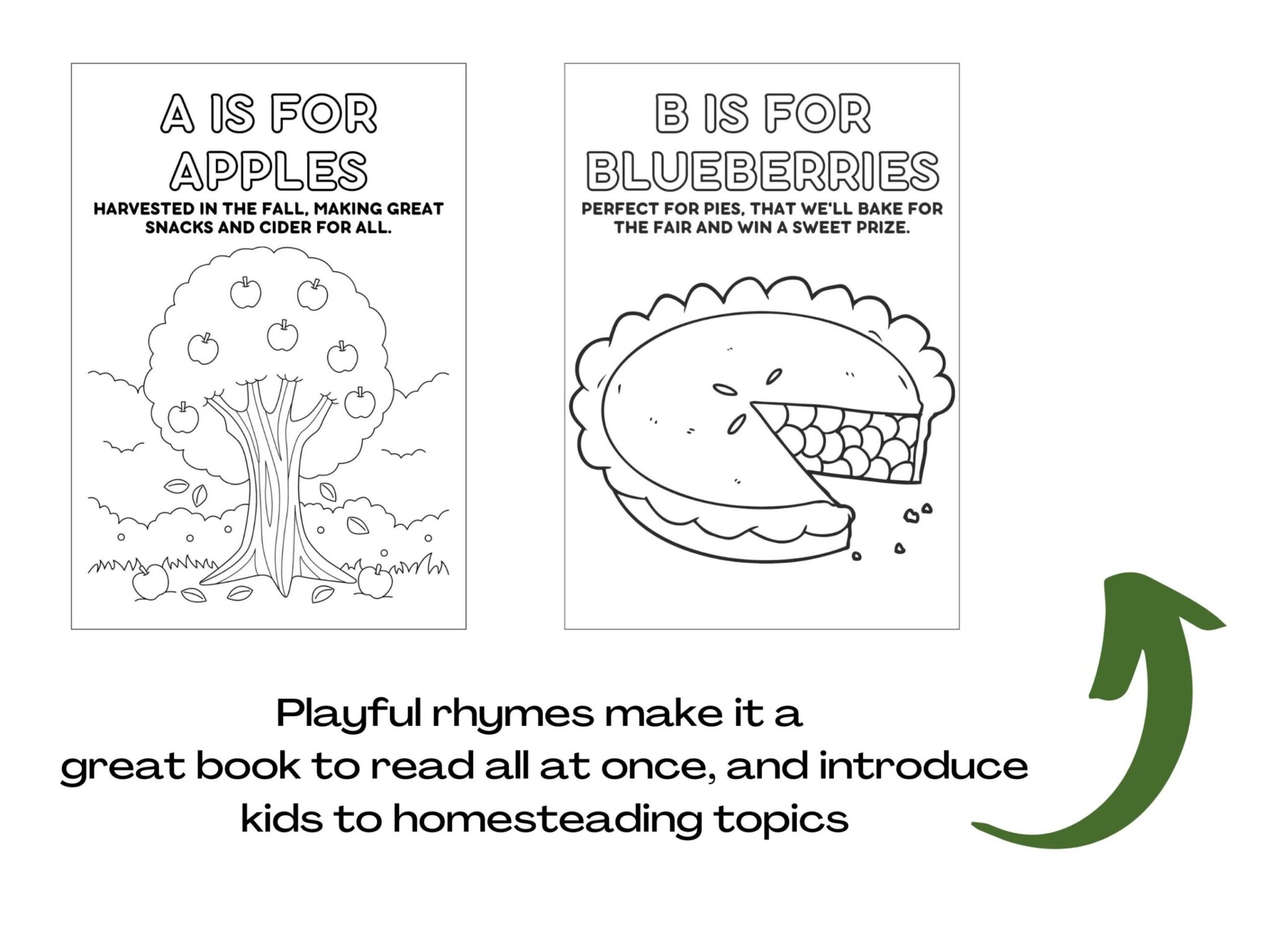 Homesteading A to Z Coloring Book with Rhyming Descriptions and 27 pages to Color