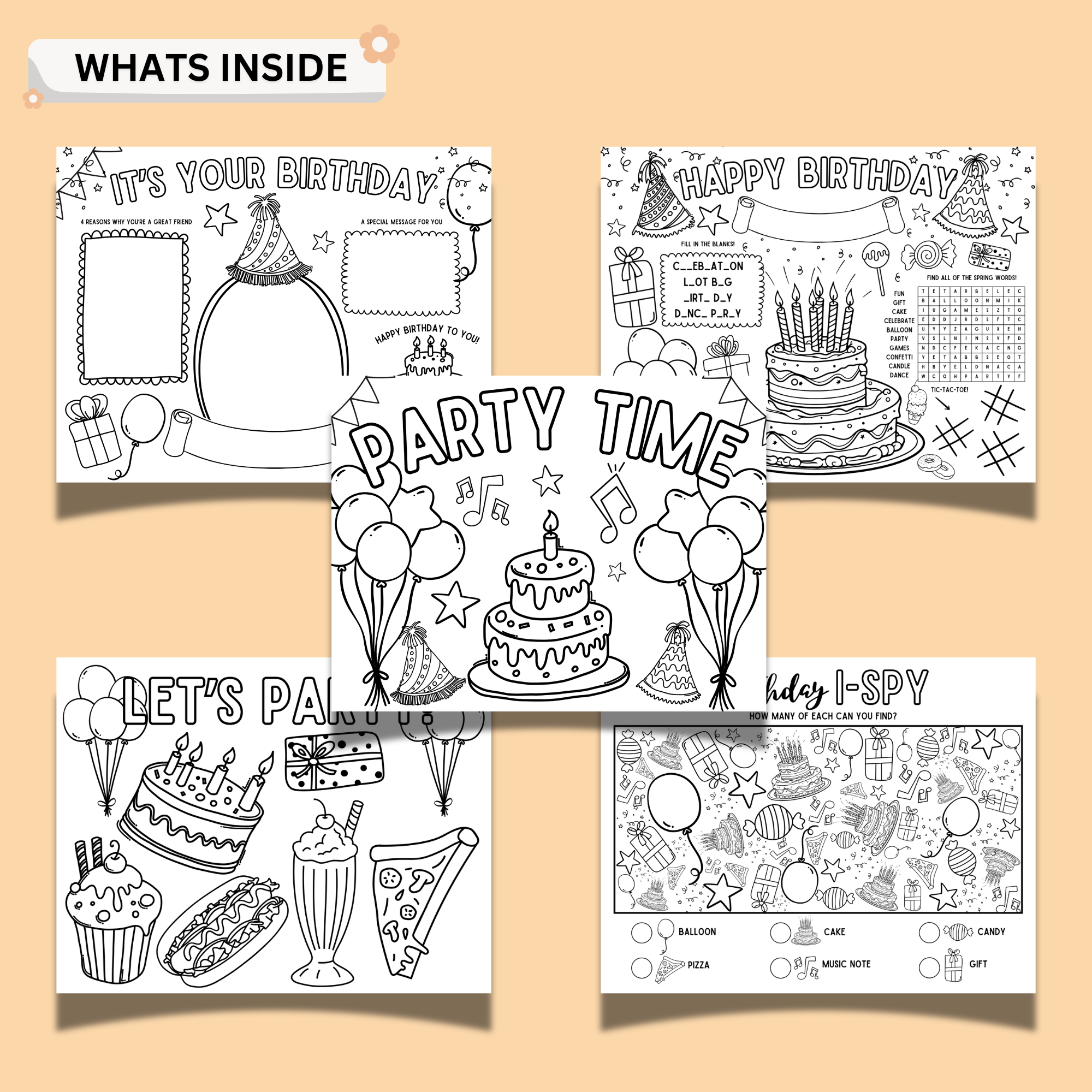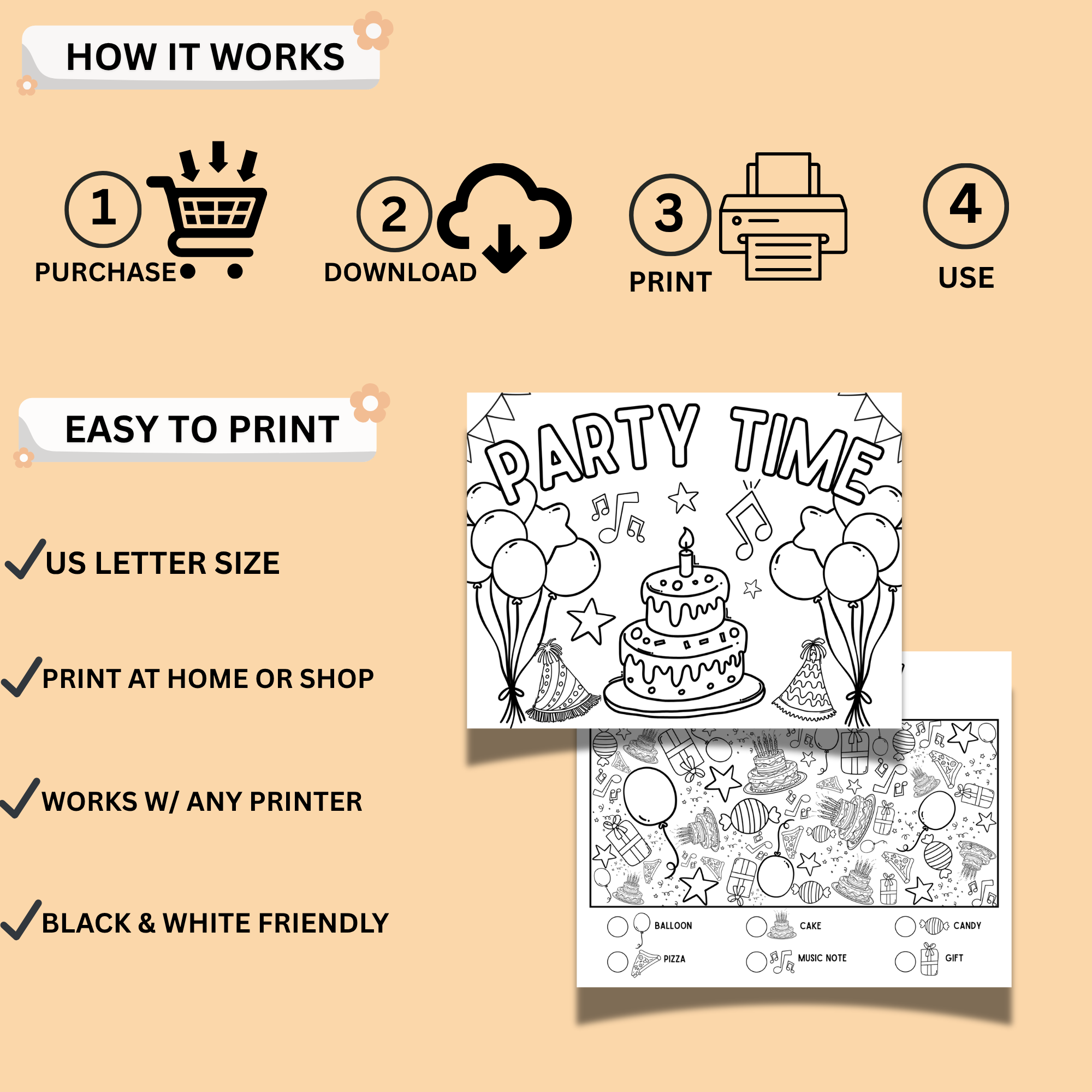 Kids Birthday Activity Placemat Printable PDF – Party Activity Sheets, Coloring Pages, I Spy Game for Kids
