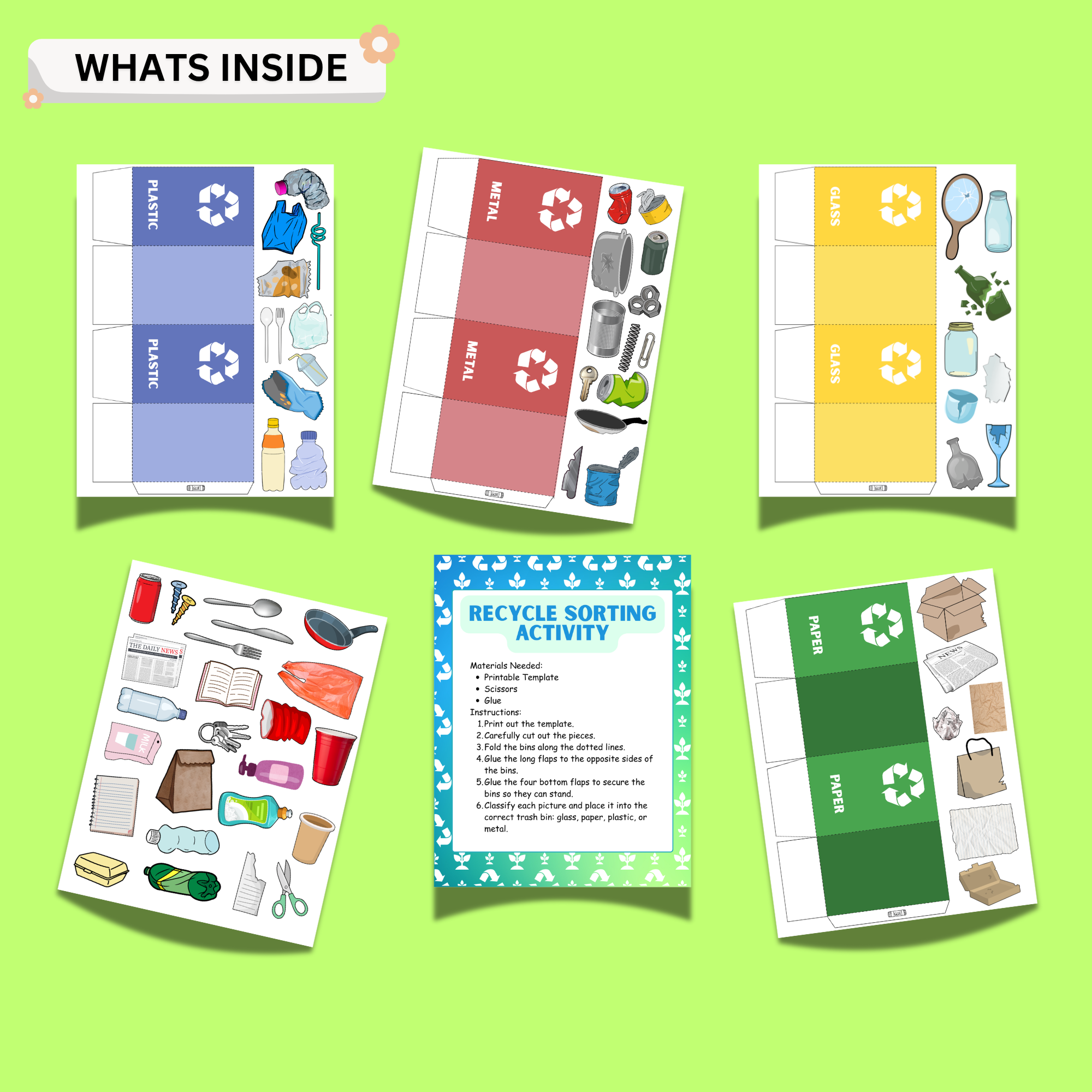 ✔ Printable recycling bins (glass, paper, plastic, metal)