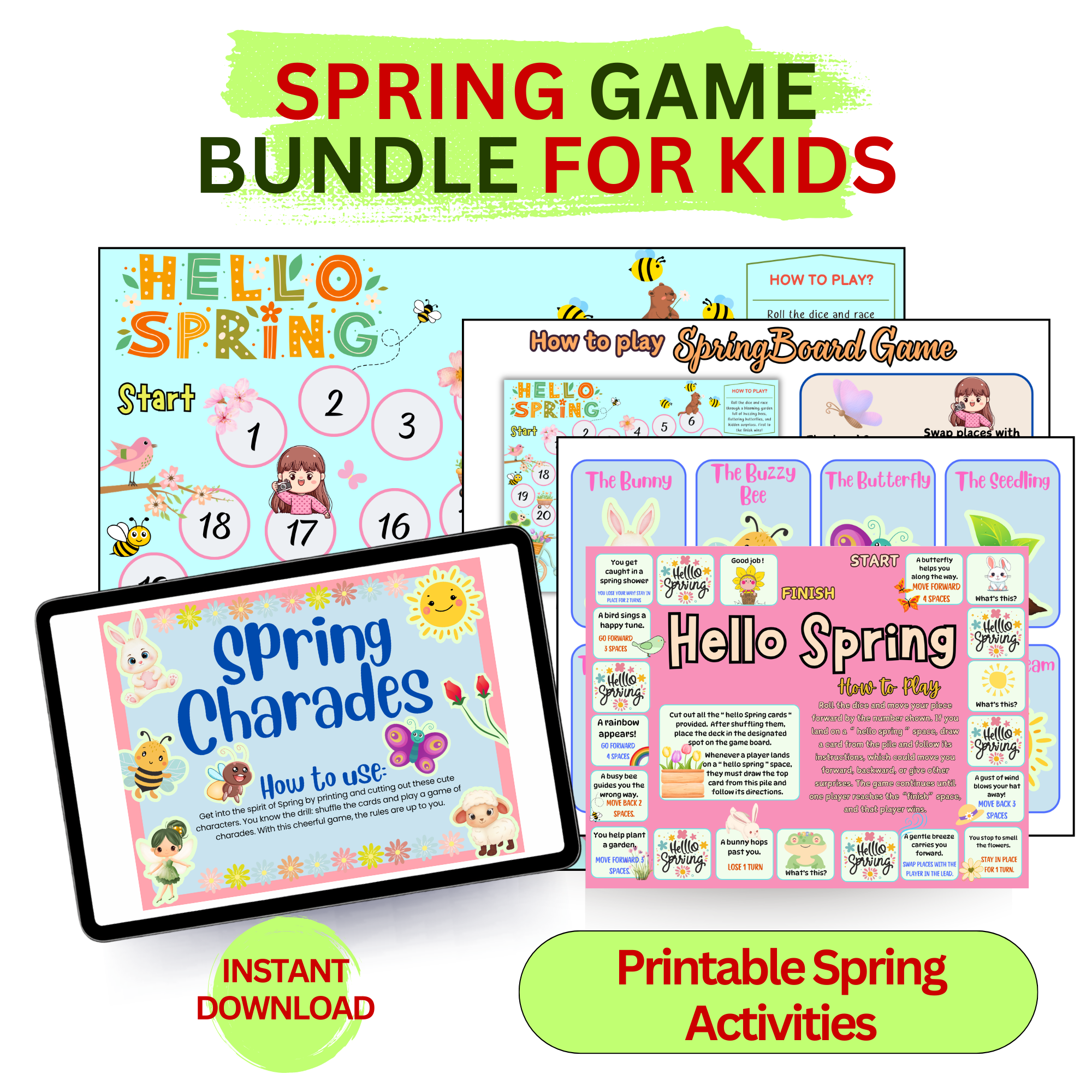 Spring Activity Bundle Printable PDF – Hello Spring Board Game and Charades Game for Kids