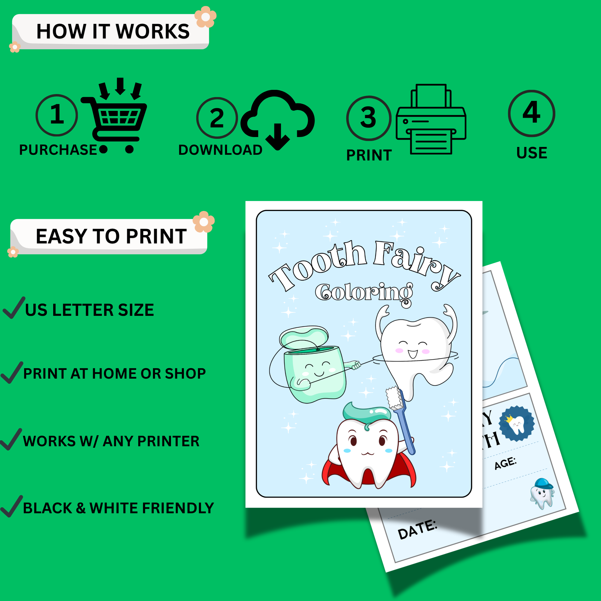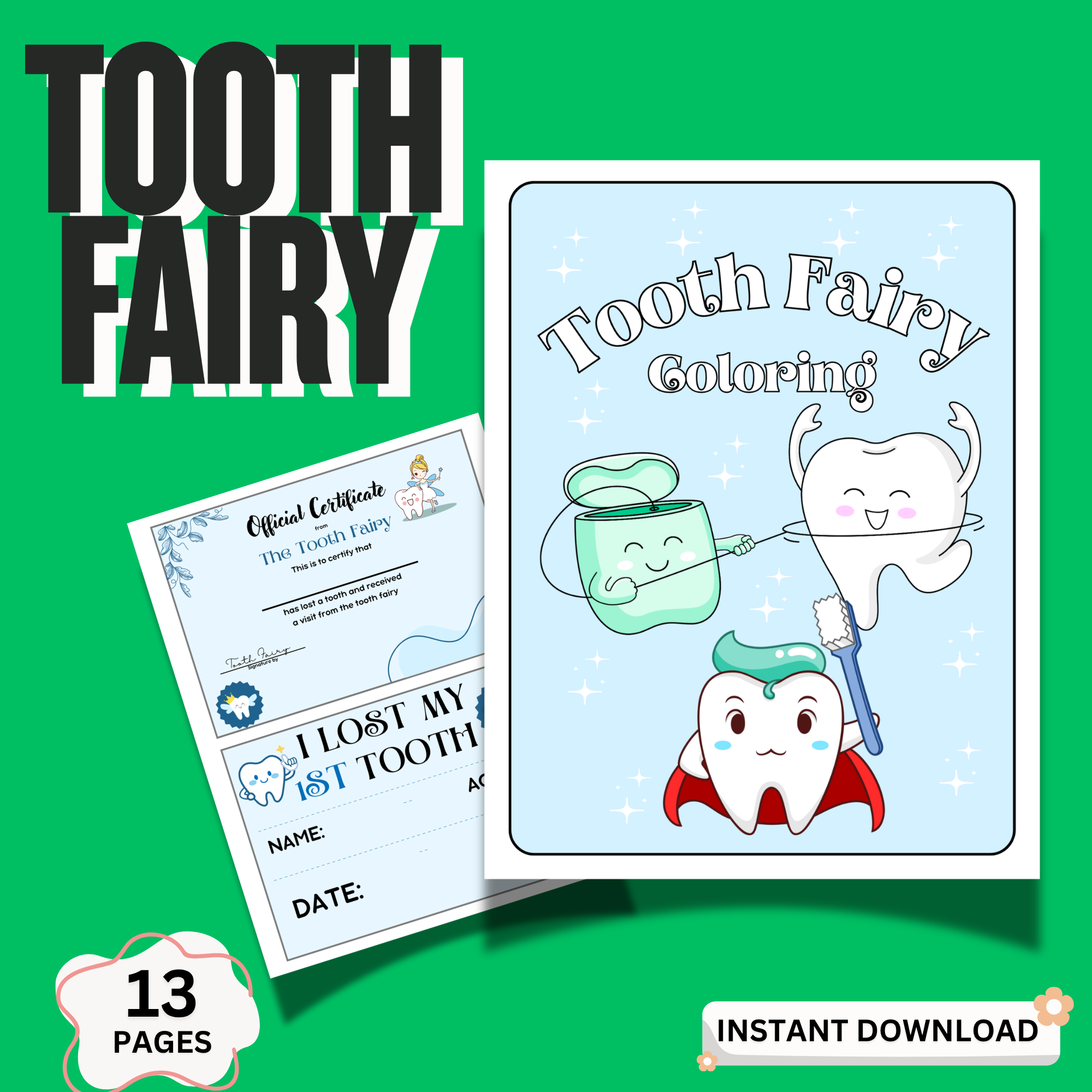 Make your child’s first lost tooth extra special with this fun and magical Tooth Fairy Printable Kit! This all-in-one bundle includes a certificate, receipt, letters, tooth tracker, and coloring pages — perfect for creating a memorable keepsake experience. Instant download, easy to print, and perfect for kids. 🦷✨