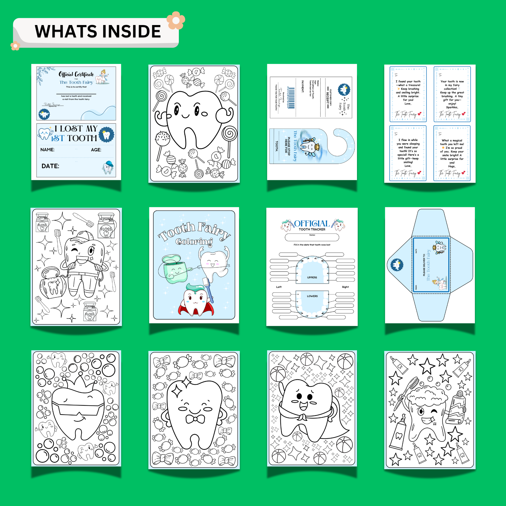 This all-in-one printable bundle includes everything you need to create a fun and memorable Tooth Fairy visit — from certificates and letters to trackers and coloring pages.